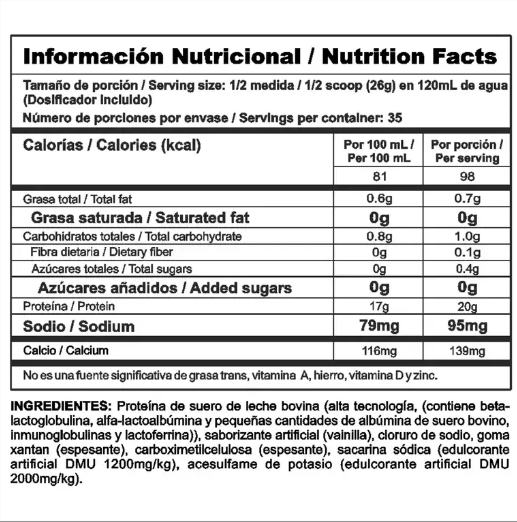 • Proteína Aislada de Suero (WPI): Proceso de intercambio iónico que garantiza la mayor concentración de proteína por gramo para una absorción ultra rápida.